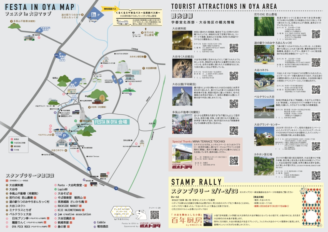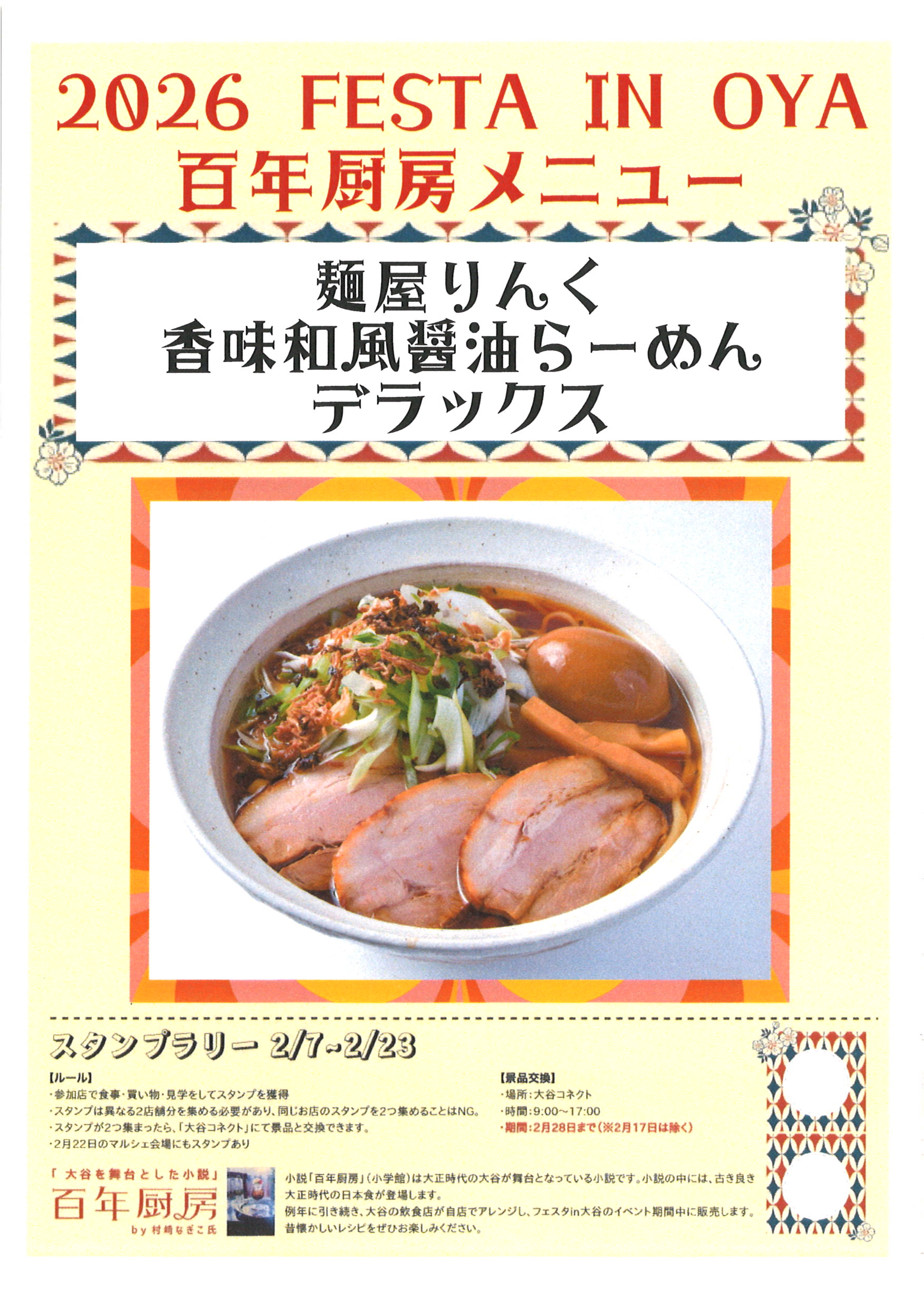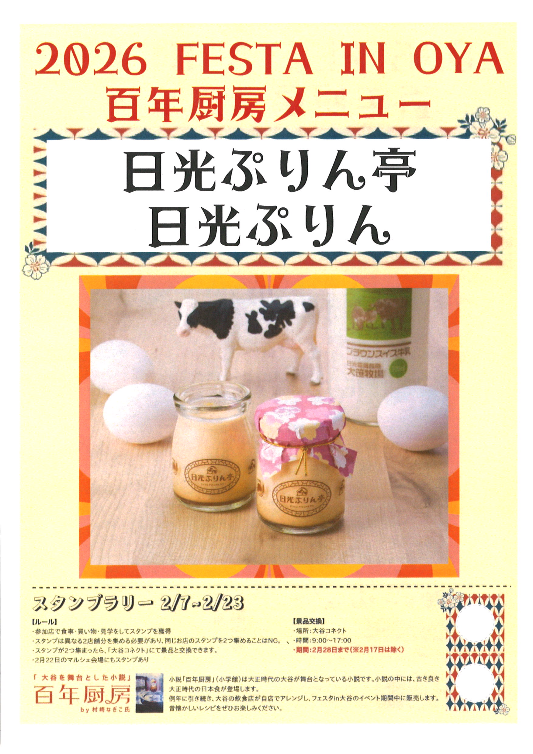 ー 2026 フェスタin大谷『百年厨房』ベルテラシェ大谷参加メニュー ー ベルテラシェ大谷各店舗での『百年厨房メニュー』のご紹介です 同時にスタンプラリー参加施設です!美味しいものを食べて景品もGETしてくださいね♪ 【スタンプラリー】 期間:2月7日(土)~23日(月祝) 実施施設:下記施設 【景品交換】 期間:2月7日(土)~28日(土)※2月17日(火)除く 場所:大谷コネクト 時間:9時~17時 *詳細*【主催Instagram】Instagram